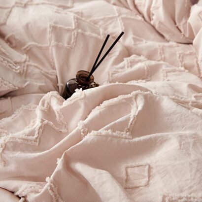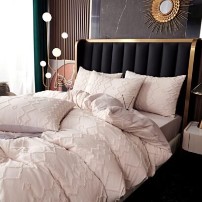 Crafted from premium microfiber, this bedding set offers unmatched softness and durability, providing a comfortable and restful night’s sleep. The gentle pink hue is adorned with intricate geometric patterns, including diamonds and zigzags, adding a subtle yet sophisticated texture to your bedding ensemble.