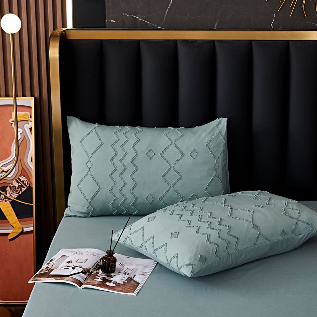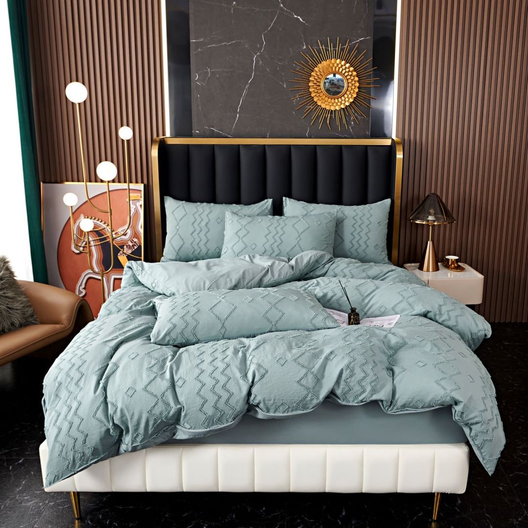 Crafted from premium microfiber, this bedding set offers exceptional softness and durability, ensuring a comfortable night’s sleep. The sophisticated design features a soothing teal color adorned with intricate geometric patterns, including diamonds and zigzags, which add a touch of modern luxury and visual interest to your space.