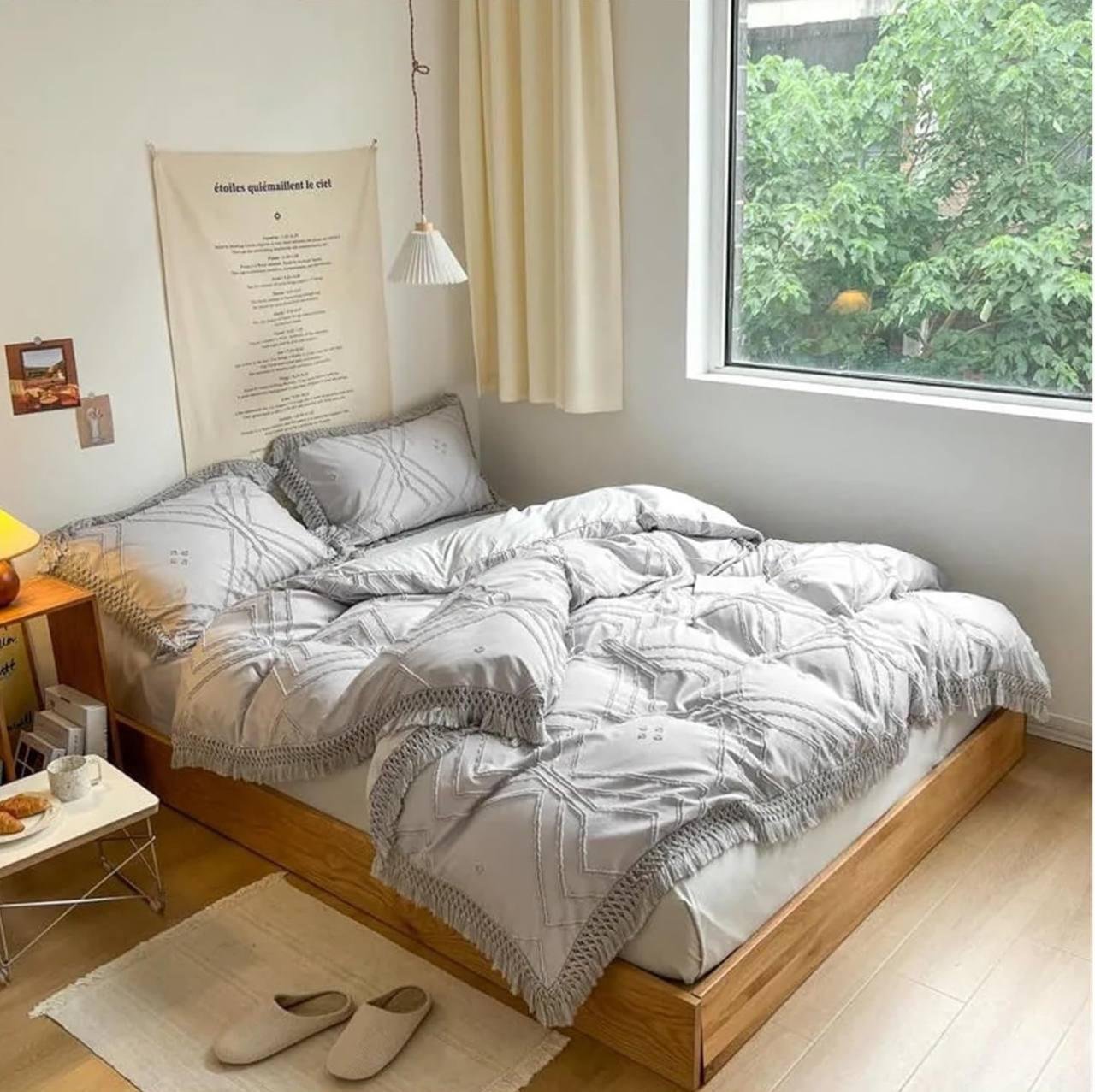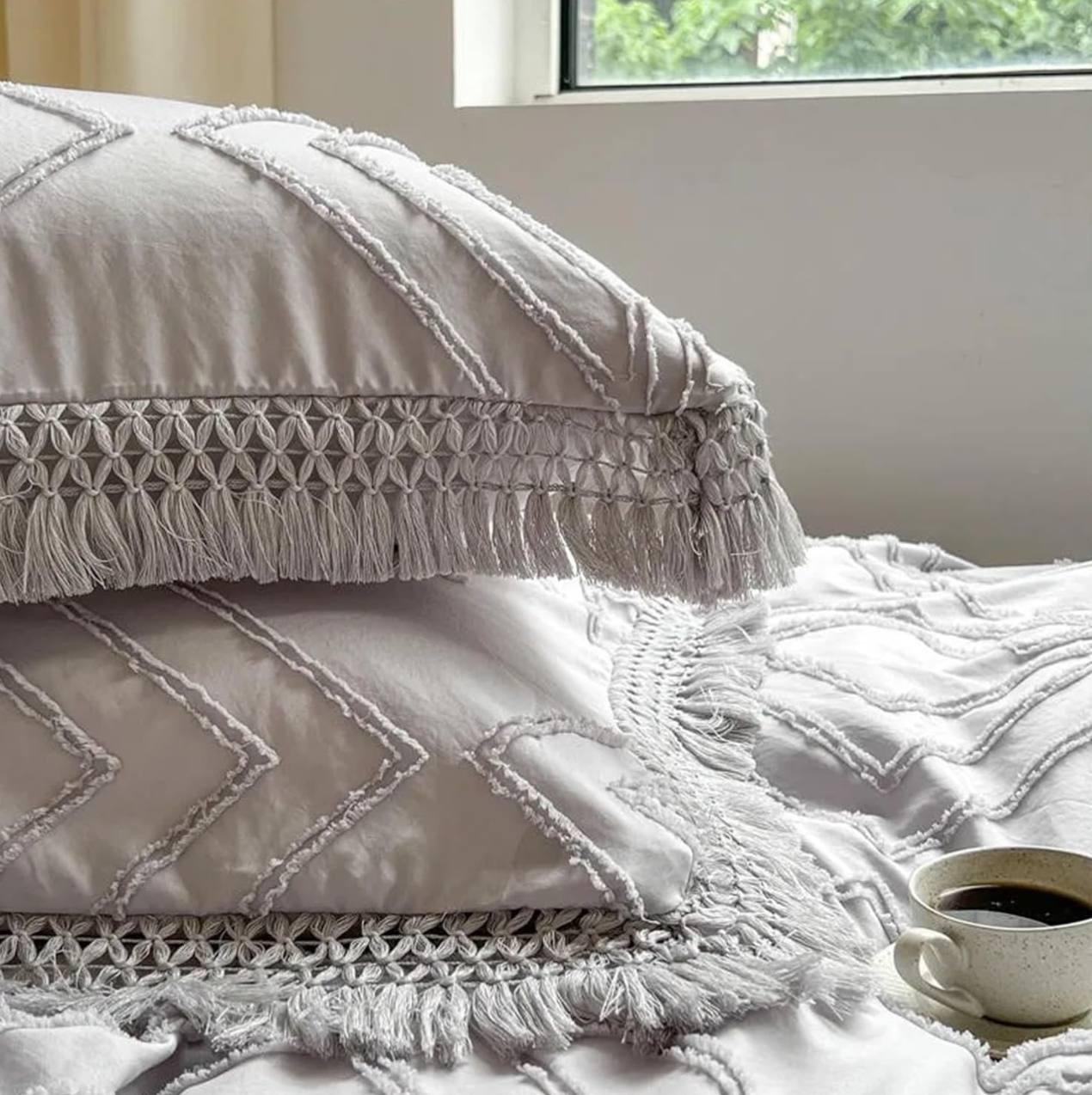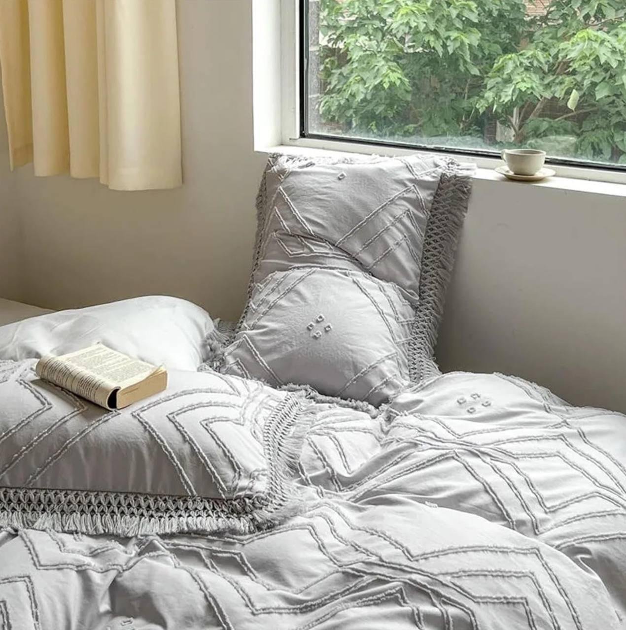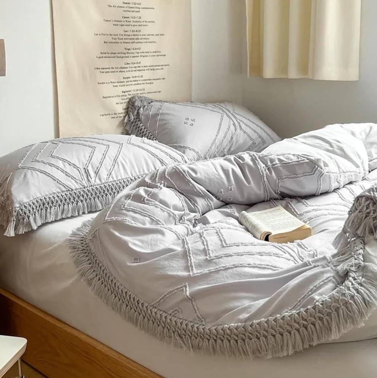 Transform your bedroom into a serene retreat with our Grey Geometric Fringe Bedding Set. This exquisite set includes 4 pillowcases, 1 bed cover,1 quilt cover, and 1 bolster case, each crafted with intricate geometric patterns and delicate fringed edges that add a touch of sophistication to your space.