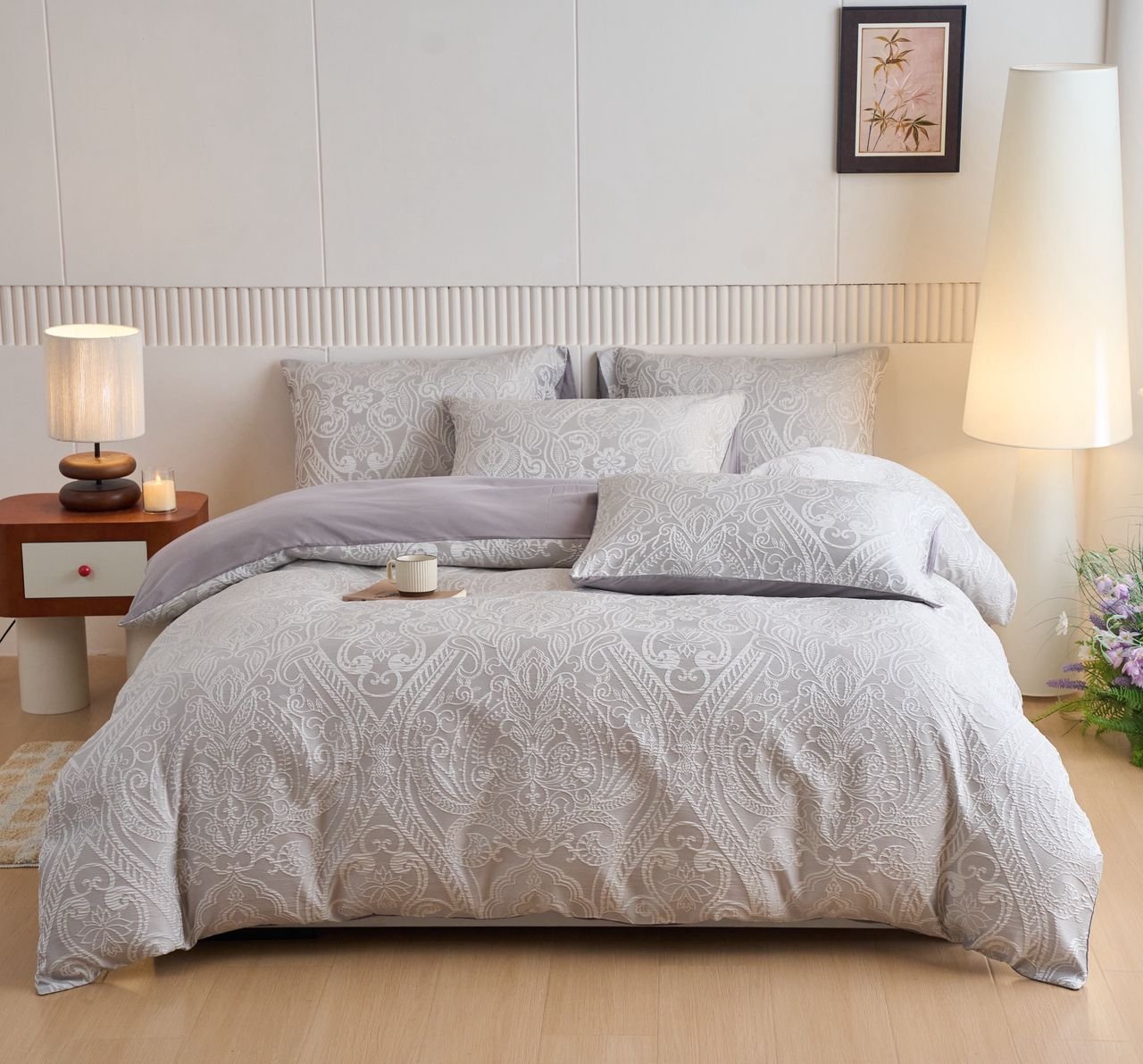 Add a touch of timeless elegance to your bedroom with this Double size bedding set, designed with an intricate lace-inspired pattern in calming neutral tones. The elegant detailing and smooth texture create a serene and sophisticated atmosphere, perfect for restful nights and stylish interiors.