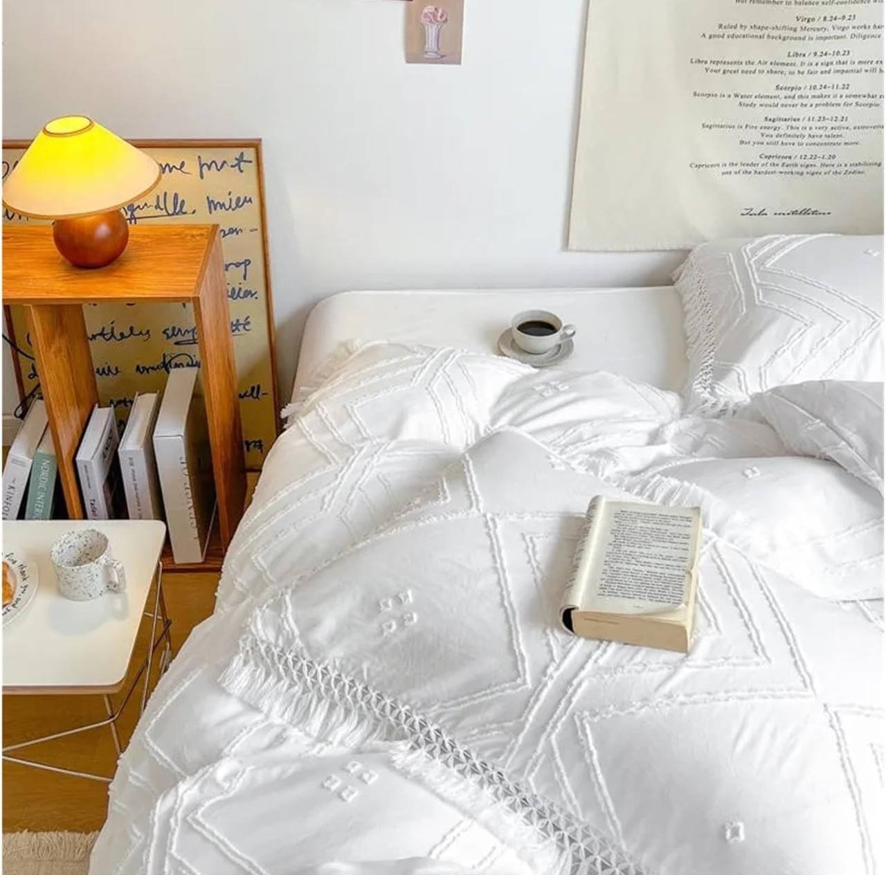 Luxurious White Bedding Set with Geometric Patterns and Fringe Border
