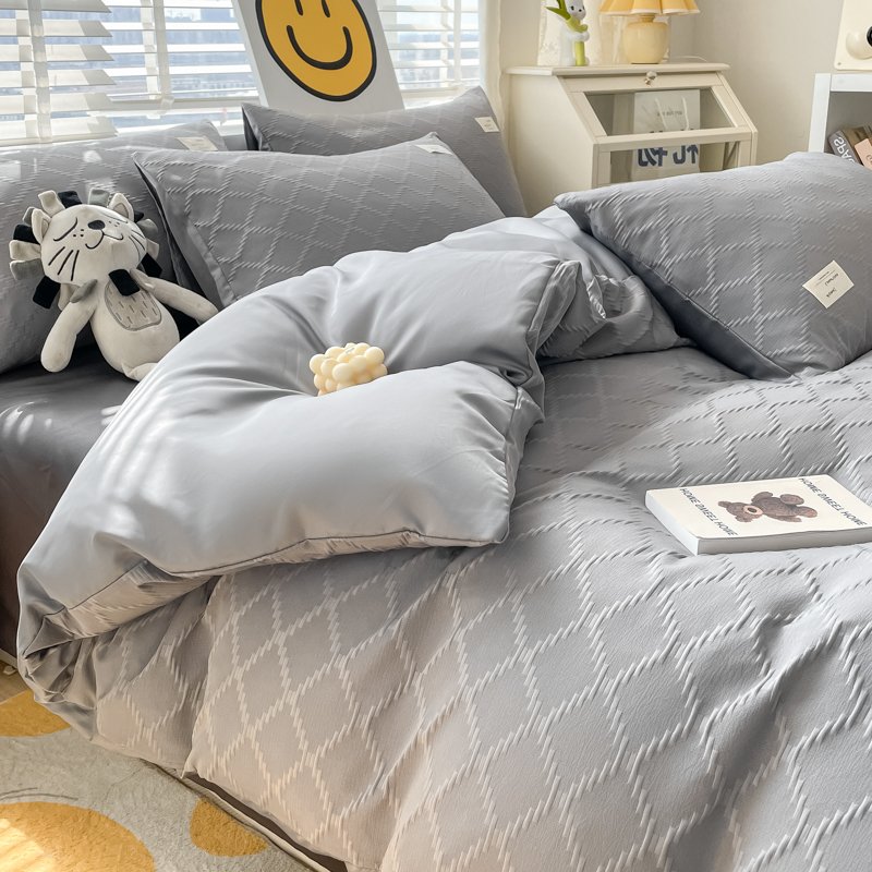 Elevate the look of your bedroom with our Modern Grey Geometric Microfiber Bedding Set. This comprehensive set includes 4 pillowcases, 1 quilt cover, 1 bed cover, and 1 bolster case, providing a stylish and cohesive appearance.