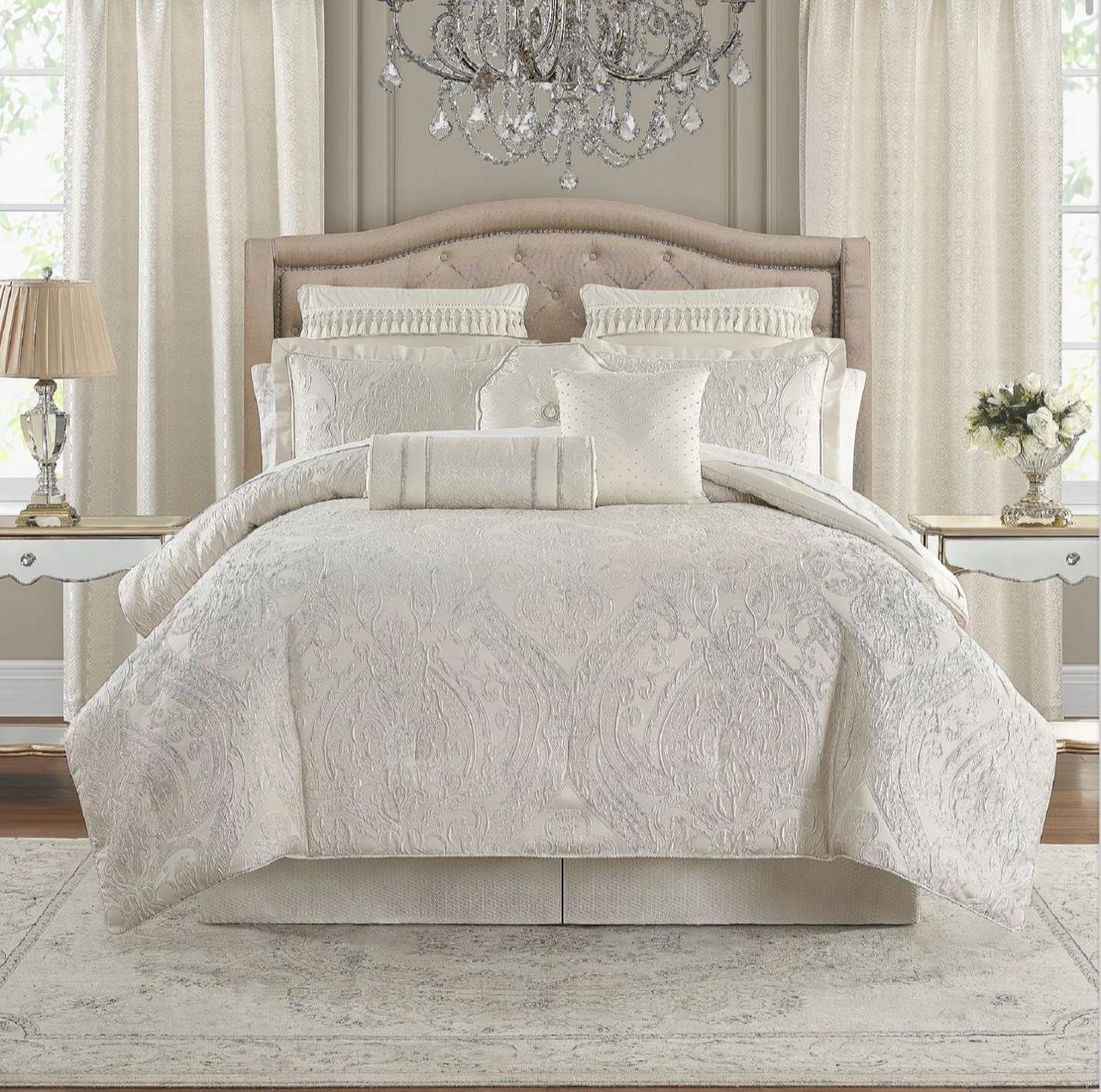 A rich classic damask jacquard pattern woven into a soft ivory fabric. The symmetrical ornamental motifs create depth and elegance, giving a truly luxury hotel and royal-inspired look.