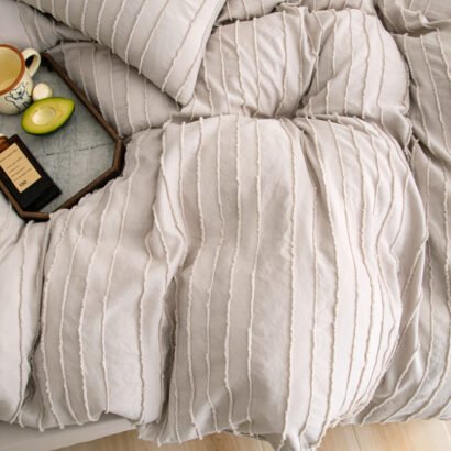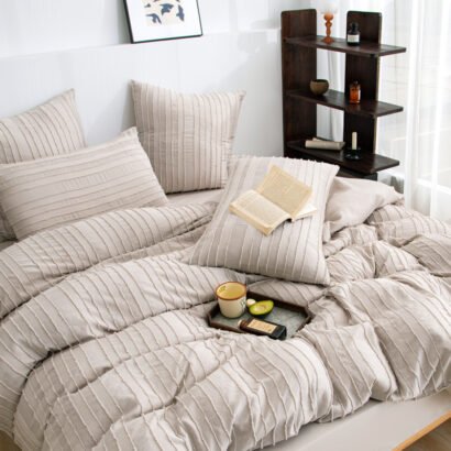 Crafted from high-quality microfiber, this bedding set offers unmatched softness and durability, providing a luxurious and restful night’s sleep. The calming beige color, adorned with delicate striped patterns, adds a touch of modern sophistication and texture to your bedding ensemble.