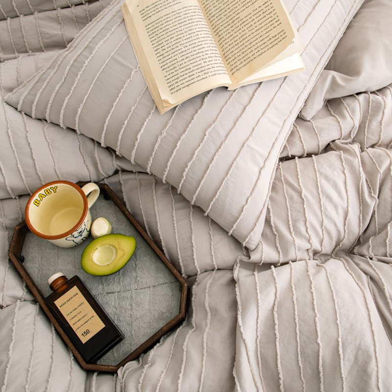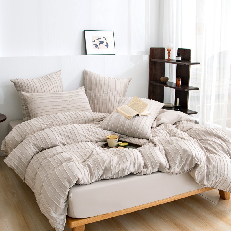 Infuse your bedroom with a sense of serenity and elegance with our Serene Beige Stripe Microfiber Bedding Set. This all-inclusive set includes 4 pillowcases, 1 quilt cover, 1 bed cover, and 1 bolster case, ensuring a harmonious and sophisticated look.