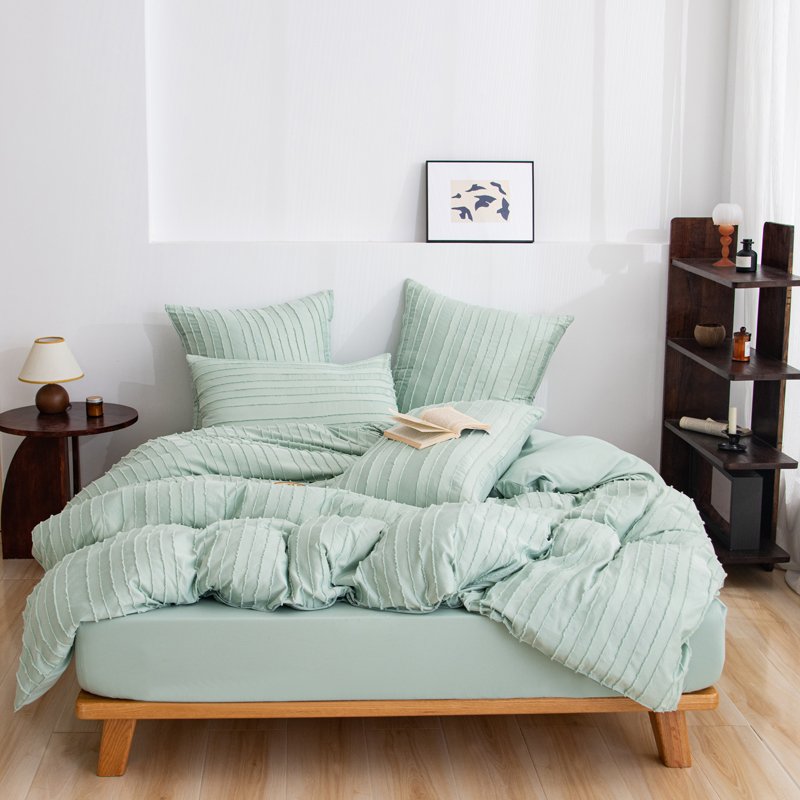 Crafted from premium microfiber, this bedding set offers unparalleled softness and durability, ensuring a comfortable and restful night’s sleep. The tranquil design features a serene mint green color complemented by delicate striped patterns, adding a subtle yet stylish texture to your bedding ensemble.
